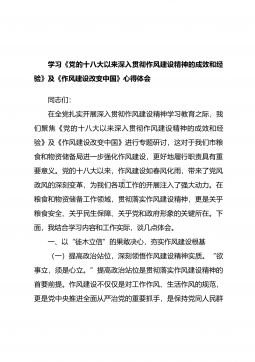 学习《党的十八大以来深入贯彻作风建设精神的成效和经验》及《作风建设改变中国》心得体会同志们:在全党扎实开展深入贯彻作风建设精神学习教育之际,我们聚焦《党的十八大以来深入贯彻作风建设精神的成效和经验》及《作风建设改变中国》进行专题研讨,这对于我们市粮食和物资储备局进一步强化作风建设,更好地履行职责具有重要意义。党的十八大以来,作风建设如春风化雨,带来了党风政风的深刻变革,为我们各项工作的开展注入了强大动力。在粮食和物资储备工作领域,贯彻落实作风建设精神,更是关乎粮食安全、关乎民生保障、关乎党和政府形象的关键所在。下面,我结合学习内容和工作实际,谈几点体会。一、以“徙木立信”的果敢决心,夯实作风建...