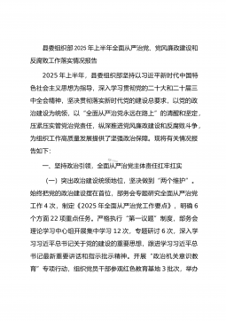 县委组织部2025年上半年全面从严治党、党风廉政建设和反腐败工作落实情况报告(2712字)2025年上半年,县委组织部坚持以习近平新时代中国特色社会主义思想为指导,深入学习贯彻党的二十大和二十届三中全会精神,坚决贯彻落实新时代党的建设总要求,以党的政治建设为统领,以“全面从严治党永远在路上”的清醒和坚定,压紧压实管党治党责任,纵深推进党风廉政建设和反腐败斗争,为组织工作高质量发展提供了坚强政治保障。现将有关情况报告如下:一、坚持政治引领,全面从严治党主体责任扛牢扛实(一)突出政治建设统领地位,坚决做到“两个维护”。始终把党的政治建设摆在首位,部务会专题研究全面从严治党工作4次,制定《2025年...