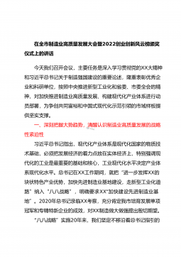 在全市制造业高质量发展大会暨2022创业创新风云榜颁奖仪式上的讲话今天我们召开会议,主要任务是深入学习贯彻党的XX大精神和习近平总书记关于制造强国建设的重要论述,隆重表彰优秀企业和科研单位,按照中央推进新型工业化和省委、市委全会的精神,对加快推进制造业高质量发展、构建现代化产业体系进行动员部署,为争创共同富裕和中国式现代化示范引领的市域样板提供坚实支撑。一、深刻把握大势趋势,清醒认识制造业高质量发展的战略性紧迫性习近平总书记指出,现代化产业体系是现代化国家的物质技术基础,必须把发展经济的着力点放在实体经济上,特别强调现代化的工业是最重要的基础和核心,工业现代化水平决定产业体系现代化水平。总书记...