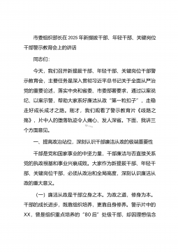 市委组织部长在2025年新提拔干部、年轻干部、关键岗位干部警示教育会上的讲话同志们:今天,我们召开新提拔干部、年轻干部、关键岗位干部警示教育会,主要任务是深入贯彻习近平总书记关于全面从严治党的重要论述,落实中央和省委、市委部署要求,通过以案说纪、以案示警,帮助大家系好廉洁从政“第一粒扣子”,走稳走好成长成才之路。刚才,我们观看了警示教育片《歧路之殇》,片中人的堕落轨迹令人痛心、发人深省。下面,我讲三个方面意见。一、提高政治站位,深刻认识干部廉洁从政的极端重要性干部是党和国家事业的中坚力量,干部廉洁与否直接关系党的执政根基和事业兴衰成败。大家作为新提拔干部、年轻干部、关键岗位干部,必须从政治和全...