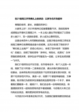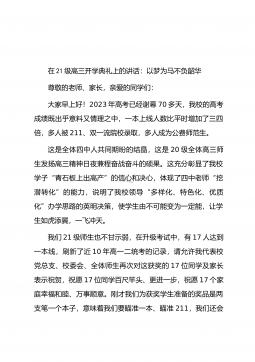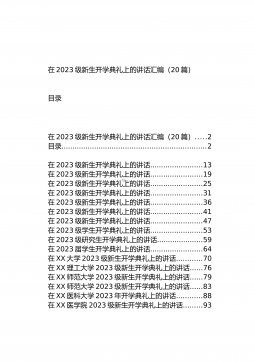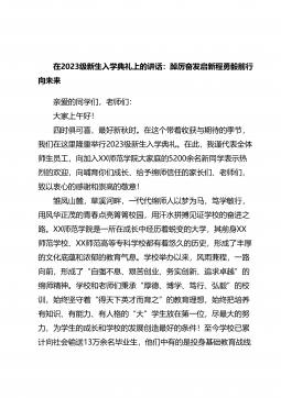 在2023级新生入学典礼上的讲话:踔厉奋发启新程勇毅前行向未来亲爱的同学们,老师们:大家上午好!四时俱可喜,最好新秋时。在这个带着收获与期待的季节,我们在这里隆重举行2023级新生入学典礼。在此,我谨代表全体师生员工,向加入XX师范学院大家庭的5200余名新同学表示热烈的欢迎,向哺育你们成长、给予绵师信任的家长们、老师们,致以衷心的感谢和崇高的敬意!雏凤山麓,草溪河畔,一代代绵师人以梦为马,笃学敏行,用风华正茂的青春点亮箐箐校园,用汗水拼搏见证学校的奋进之路。XX师范学院是一所在成长中经历着蜕变的大学,其前身XX师范学校、XX师范高等专科学校都有着悠久的历史,形成了丰厚的文化底蕴和浓郁的教育气...