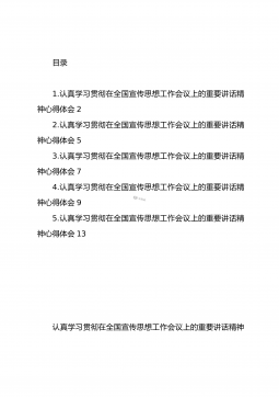 目录1.认真学习贯彻在全国宣传思想工作会议上的重要讲话精神心得体会22.认真学习贯彻在全国宣传思想工作会议上的重要讲话精神心得体会53.认真学习贯彻在全国宣传思想工作会议上的重要讲话精神心得体会74.认真学习贯彻在全国宣传思想工作会议上的重要讲话精神心得体会95.认真学习贯彻在全国宣传思想工作会议上的重要讲话精神心得体会13认真学习贯彻在全国宣传思想工作会议上的重要讲话精神心得体会在全国宣传思想工作会议上,习主席深刻阐明了宣传思想工作的地位作用、目标任务、职责使命、实践要求,系统回答了宣传思想工作方向性、全局性、战略性的重大问题,并明确指出,这些重要思想是做好宣传思想工作的根本遵循,必须长期坚...
