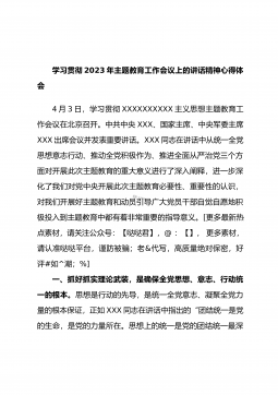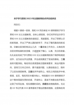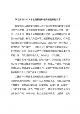 学习贯彻2023年主题教育讲话内容的研讨发言在全党深入开展学习贯彻习近平新时代中国特色社会主义思想主题教育,是贯彻落实党的XX大精神的重大举措,对于统一全党思想、解决党内存在的突出问题、始终保持党同人民群众血肉联系、推动党和国家事业发展具有重要意义。作为国有企业纪检干部要切实提高政治站位,坚定拥护“两个确立”、坚决做到“两个维护”,深刻认识开展主题教育的重大意义,把思想和行动统一到习近平总书记重要讲话精神和党中央决策部署上来,切实增强思想自觉、政治自觉、行动自觉。一是要坚持学思用贯通、知信行统一,深刻领会习近平总书记关于党的自我革命战略思想,关于全面从严治党、党风廉政建设和反腐败斗争系列重要论...