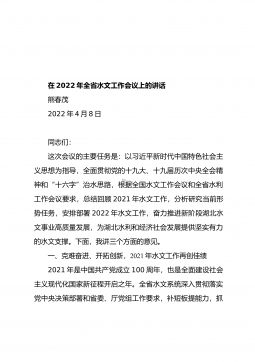 在2022年全省水文工作会议上的讲话熊春茂2022年4月8日同志们:这次会议的主要任务是:以习近平新时代中国特色社会主义思想为指导,全面贯彻党的十九大、十九届历次中央全会精神和“十六字”治水思路,根据全国水文工作会议和全省水利工作会议要求,总结回顾2021年水文工作,分析研究当前形势任务,安排部署2022年水文工作,奋力推进新阶段湖北水文事业高质量发展,为湖北水利和经济社会发展提供坚实有力的水文支撑。下面,我讲三个方面的意见。一、克难奋进、开拓创新,2021年水文工作再创佳绩2021年是中国共产党成立100周年,也是全面建设社会主义现代化国家新征程开启之年。全省水文系统深入贯彻落实党中央决策部...