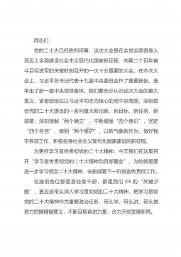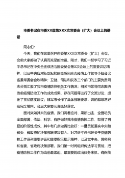 市委书记在市委XX届第XXX次常委会(扩大)会议上的讲话同志们:今天,我们在这里召开市委第XXX次常委会(扩大)会议,会前大家都做了认真而充足的准备。刚才,我们一起学习了习近平总书记在中央全面依法治国委员会第X次会议上的重要讲话精神,以及中央应对新型冠状病毒感染肺炎疫情工作领导小组会议省委常委会会议精神;卫健、司法和发改三个部门的主要负责同志分别汇报了我市疫情防控相关工作情况;相关市领导同志围绕当前疫情防控工作的成效成果、存在问题等进行了交流讨论,提出了贯彻落实建议;建军市长作了具体部署要求,讲的都非常好我完全赞同。会后大家要认真抓好落实。面对突如其来的疫情,我们沉着应对、果断出击,全面动员全...