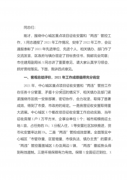 同志们:刚才,围绕中心城区重点项目征收安置和“两违”管控工作,X同志通报了2021年工作情况、安排了2022年工作,会议通报表彰了2021年先进单位、先进个人,相关镇办、部门作了交流发言,区政府与镇办签定了目标责任书,我都完全同意;市住建局副局长X同志讲了重要意见,请大家认真学习领会、抓好贯彻落实。下面,我讲四点意见。一、客观总结评价,2021年工作成绩值得充分肯定2021年,中心城区重点项目征收安置和“两违”管控工作在任务十分繁重、矛盾十分突出的情况下,相关镇办及部门紧紧围绕市区统一安排部署,密切协作,合力攻坚,取得了显著成效,得到了市委、市政府的肯定。一是房屋征收安置取得重大进展。中心城区...