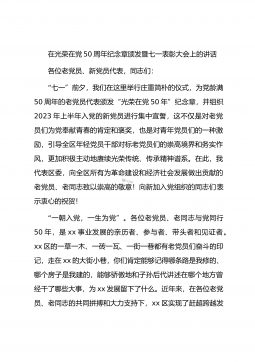 在光荣在党50周年纪念章颁发暨七一表彰大会上的讲话各位老党员、新党员代表,同志们:“七一”前夕,我们在这里举行庄重简朴的仪式,为党龄满50周年的老党员代表颁发“光荣在党50年”纪念章,并组织2023年上半年入党的新党员进行集中宣誓,这不仅是对老党员们为党奉献青春的肯定和褒奖,也是对青年党员们的一种激励,引导全区年轻党员干部对标老党员们的崇高境界和务实作风,更加积极主动地赓续光荣传统、传承精神谱系。在此,我代表区委,向全区所有为革命建设和经济社会发展做出贡献的老党员、老同志致以崇高的敬意!向新加入党组织的同志们表示衷心的祝贺!“一朝入党,一生为党”。各位老党员、老同志与党同行50年,是xx事业发...