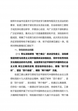 按照中央省市区委关于召开党史学习教育专题民主生活会的的要求,街道工委班子紧扣民主生活会主题,在会前组织工委班子成员深化理论研学、开展谈心谈话,向广大党员干部和群众广泛征求意见,重点从五个方面查摆差距和不足,深刻剖析问题成因,明确了今后努力的方向和整改措施。此次民主生活会共征求到领导班子意见建议×条,班子成员意见建议×条。现将对照检查情况汇报如下:一、存在的突出问题(一)带头深刻感悟“两个确立”的决定性意义,深刻感悟坚持把马克思主义同中国具体实际相结合、同中华优秀传统文化相结合的非凡历程,全面贯彻习近平新时代中国特色社会主义想,树立正确党史观,坚定信仰信念信心,增强“四个意识”、坚定“四个自信”...