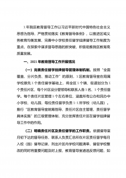 X年我区教育督导工作以习近平新时代中国特色社会主义思想为指导,严格贯彻落实《教育督导条例》,以推进区域义务教育均衡发展、完善中小学校责任督学挂牌督导工作制度为重点,在探索中谋求督导思路的新突破,积极助推我区教育高质量发展。一、2021年教育督导工作开展情况(一)完善责任督学挂牌督导管理体制机制。按照“全面覆盖、分片负责、推动工作”的原则,X区教育督导室在局属学校原先X个责任督学基础上,将全区X个镇、街道划分为X个责任片区,每个片区设分管领导和联系人各X名、X个责任督学。每个责任片区管理X个左右单位,涵盖所有公办和民办中小学校、幼儿园,每位责任督学负责X-X所学校(幼儿园)。推行“区教育督导室统...