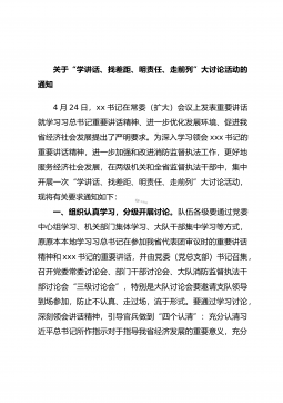 关于“学讲话、找差距、明责任、走前列”大讨论活动的通知4月24日,xx书记在常委(扩大)会议上发表重要讲话就学习习总书记重要讲话精神、进一步优化发展环境、促进我省经济社会发展提出了严明要求。为深入学习领会xxx书记的重要讲话精神,进一步加强和改进消防监督执法工作,更好地服务经济社会发展,在两级机关和全省监督执法干部中,集中开展一次“学讲话、找差距、明责任、走前列”大讨论活动,现将有关要求通知如下:一、组织认真学习,分级开展讨论。队伍各级要通过党委中心组学习、机关部门集体学习、大队干部集中学习等方式,原原本本地学习习总书记在参加我省代表团审议时的重要讲话精神和xxx书记的重要讲话,并由党委(党总...