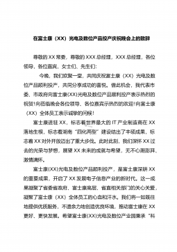 在富士康(XX)光电及数位产品投产庆祝晚会上的致辞尊敬的XX常委,尊敬的XXX总经理,XXX总经理,各位领导,各位嘉宾,女士们、先生们:今晚,我们欢聚一堂,共同庆祝富士康(XX)光电及数位产品顺利投产,共同分享成功的喜悦。借此机会,我代表市委、市政府向富士康(XX)光电及数位产品顺利投产表示热烈的祝贺!向莅临晚会各位领导、各位嘉宾示热烈的欢迎!向富士康(XX)全体员工表示诚挚的问候!富士康进驻XX,标志着世界最大的IT产业制造商在XX落地生根,标志着湖南“四化两型”建设结出了丰硕成果,标志着XX对外开放迈出了重大步伐。此时此刻,我们深怀XX过去的光荣与梦想,展望XX未来的成就与希望,无不心潮澎...
