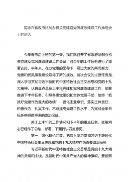 同志在省政府法制办机关党建暨党风廉政建设工作推进会上的讲话今年春节后上班的第一天,我们就召开了省政府法制办机关党建及党风廉政建设工作会议,对全年的工作任务进行了部署安排。半年来,在办党组的领导下,经过大家的共同努力,党建和党风廉政建设取得了新的成效。这次会议的主要任务是,深入学习贯彻习近平新时代中国特色社会主义思想和党的十九大精神,认真盘点总结上半年党建和党风廉政建设工作,部署推进下半年任务,引导各级党组织和全体党员干部,始终“把抓好党建作为最大的政绩”,强化主业意识、落实主体责任,积极作为,扎实工作,不断提高党建工作水平,为完成全年目标任务提供坚强的政治保证。 关于上半年的工作情况和下半年...