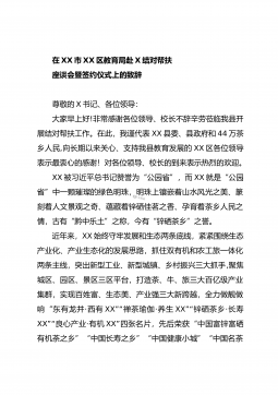 在XX市XX区教育局赴X结对帮扶座谈会暨签约仪式上的致辞尊敬的X书记、各位领导:大家早上好!非常感谢各位领导、校长不辞辛劳莅临我县开展结对帮扶工作。在此,我谨代表XX县委、县政府和44万茶乡人民,向长期以来关心、支持我县教育发展的XX区各位领导表示最衷心的感谢!对各位领导、校长的到来表示热烈的欢迎。XX被习近平总书记赞誉为“公园省”,而XX就是“公园省”中一颗璀璨的绿色明珠,明珠上镶嵌着山水风光之美、篆刻着人文景观之奇、蕴藏着锌硒佳茗之香、孕育着茶乡人民之情,古有“黔中乐土”之称,今有“锌硒茶乡”之誉。近年来,XX始终守牢发展和生态两条底线,紧紧围绕生态产业化、产业生态化的发展思路,抓住双有机...
