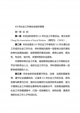 XX市社会工作者协会组织章程第一章总则第一条本协会的名称为XX市社会工作者协会。英文名称:ChengDuAssociationofSocialWorkers(缩写为:CDSW)。第二条本协会是由XX市社会工作者和在XX市从事社会工作或在社会工作行业、学科领域内具有一定影响力或代表性的单位自愿组成的,按照章程开展活动的,具有公益性、联合性、专业性、地方性、非营利性的社会团体。本章程所称社会工作者,是指取得全国社会工作者职业水平证书的专业人士,或在社会工作行业、学科领域内具有一定影响或贡献的人士。第三条本协会的宗旨是遵守宪法、法律、法规和国家政策,遵守社会道德风尚,以谋求XX市社会工作的交流、研究...