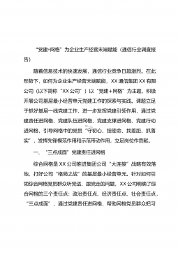 “党建+网格”为企业生产经营末端赋能(通信行业调查报告)随着信息技术的快速发展,通信行业竞争日趋激烈。在此形势下,如何为企业生产经营末端赋能,XX通信集团XX有限公司(以下简称“XX公司”)以“党建+网格”为主题,积极开展公司基层最小经营单元党建工作的探索与实践。课题立足于抓好基层一线党建工作,进一步发挥党建引领作用,通过党建责任进网格、党建队伍进网格、党建支撑进网格、党建行动进网格,引导网格中的党员“守初心、担使命、找差距、抓落实”,发挥先锋模范作用和示范带动作用,立足岗位作贡献。一、“三点成面”党建责任进网格综合网格是XX公司推进集团公司“大连接”战略有效落地,打好公司“格局之战”的基层最...