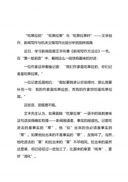 “吃草拉奶”“吃草拉草”与“吃草拉草籽”——文学创作、新闻写作与机关文稿写作比较分析的别样视角近日,学习新闻前辈艾丰所著《新闻写作方法论》一书。在“第一版前言”中,看到这么一段饶有趣味的对话:一位作家这样揶揄记者:“我们作家是吃草拉奶,你们记者是吃草拉草。”一位记者反唇相讥:“假如要我承认你说得对,那么我要补充一句:有的作家是吃草拉奶,而有的作家恐怕是吃草拉屎。”这些话,话糙理不糙。艾丰先生认为,如果剔除“吃草拉草”一语中的讽刺意味这句话说得确实有理——新闻报道者,事实的报道也。记者吃进去的是事实的“草”,他“拉”出来的也必须是事实的“草”。如果他拉出来的不是事实的“草”,反倒坏了。当然,他吃...