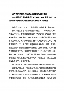 通力协作共建新时代安全高效的银行服务体系——中国银行业协会秘书长XXX在20XX中国(XX)金融安全与科技创新论坛暨重点项目签约仪式上的致辞尊敬的X市长、X院士、各位领导、各位专家、各位来宾:很高兴有机会与中国信息通信研究院、XX市锦江区人民政府及众位领导、专家和嘉宾欢聚在“天府之国”的蓉城,共同见证和参加20XX中国(XX)金融安全与科技创新论坛暨重点项目签约仪式。此次聚焦金融安全与科技创新论坛的举办,是贯彻落实党中央、国务院决策部署的具体体现,是进一步推动金融安全与科技创新融合的良好机遇,是互相沟通、交流和合作共赢的有益平台,我谨代表中国银行业协会热烈祝贺20XX中国(XX)金融安全与科技...