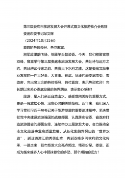 第三届娄底市旅游发展大会开幕式暨文化旅游推介会致辞娄底市委书记邹文辉(2024年10月25日)尊敬的各位领导、各位来宾:湘军故里韵飞扬,纸墨竿头翰迹香。今天,我们相聚富厚双峰,隆重举行第三届娄底市旅游发展大会,共赴诗与远方之约、共品耕读传家之韵、共赏天下水府之胜,这是娄底文旅事业发展的一件大好事、大喜事。在此,我谨代表娄底市委、市政府,向出席大会的各位领导、各位嘉宾,表示热烈欢迎!向长期以来关心娄底发展的各界朋友,表示衷心感谢!旅游,是人们亲近自然山水、感受世间美好的重要方式,更是一段放松心情、治愈心灵的美妙旅程。近年来,我们深入学习贯彻习近平总书记关于旅游发展的重要论述精神,坚决贯彻党中央建...