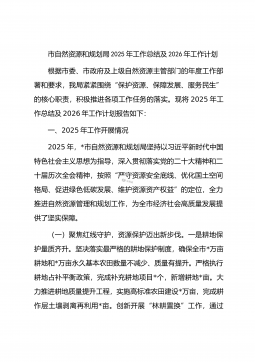 市自然资源和规划局2025年工作总结及2026年工作计划根据市委、市政府及上级自然资源主管部门的年度工作部署和要求,我局紧紧围绕“保护资源、保障发展、服务民生”的核心职责,积极推进各项工作任务的落实。现将2025年工作总结及2026年工作计划报告如下:一、2025年工作开展情况2025年,*市自然资源和规划局坚持以习近平新时代中国特色社会主义思想为指导,深入贯彻落实党的二十大精神和二十届历次全会精神,按照“严守资源安全底线、优化国土空间格局、促进绿色低碳发展、维护资源资产权益”的定位,全力推进自然资源管理和规划工作,为全市经济社会高质量发展提供了坚实保障。(一)聚焦红线守护,资源保护迈出新步伐...