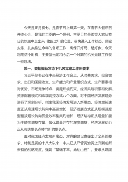 今天是正月初七,是春节后上班第一天。在春节大假后召开收心会,是我们工委的一个惯例,主要目的是希望大家从节日的氛围中走出来,收回过年的心思,尽快进入工作状态,周密安排、扎实推进今年的各项工作,确保开好局、起好步。今天利用这个时机,主要就当前和今后一个时期的机关党建工作谈一些想法。第一,要把握新常态下机关党建工作新要求习近平总书记在中央经济工作会上,从消费需求、投资需求、出口和国际收支、生产能力和产业组织方式、生产要素相对优势、市场竞争特点、资源环境约束、经济风险积累和化解、资源配置模式和宏观调控方式八个方面,对中国经济发展趋势进行了深刻分析,指出我国经济发展进入新常态,经济增长速度正从高速增长转...