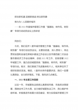 抓住新机遇迎接新挑战树立新形象努力为X人民管好城市——在2022年度城市管理工作暨“强基础、转作风、树形象”专项行动动员会议上的讲话同志们:今天,我们召开X度年城市管理工作暨“强基础、转作风、树形象”专项行动动员会议。主要目的是,深入贯彻X、传达贯彻全国和全省住房城乡建设工作会议以及市委四届二次全会暨市委经济工作会议精神,总结2021年工作,安排部署2022年城管工作,强力启动城管系统“强基础、转作风、树形象”专项行动。刚才,我们表扬了先进集体和个人,相关单位作了很好的表态发言。稍后,X副市长将作重要讲话,我们一定要认真领会、全力抓好落实。下面,我先讲几点意见。一、2021年主要工作回顾...