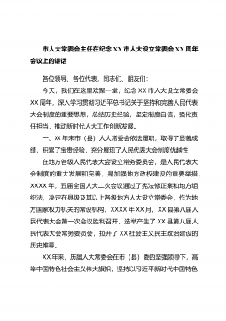 市人大常委会主任在纪念XX市人大设立常委会XX周年会议上的讲话各位领导、各位代表,同志们、朋友们:今天,我们在这里欢聚一堂,纪念XX市人大设立常委会XX周年,深入学习贯彻习近平总书记关于坚持和完善人民代表大会制度的重要思想,总结历史经验,坚定制度自信,强化责任担当,推动新时代人大工作创新发展。一、XX年来市(县)人大常委会依法履职,取得了显著成绩,积累了宝贵经验,充分展现了人民代表大会制度优越性在地方各级人民代表大会设立常务委员会,是人民代表大会制度的重大发展和完善,是加强地方政权建设的重要举措。XXXX年,五届全国人大二次会议通过了宪法修正案和地方组织法,决定在县级及其以上各级地方人大设立常...
