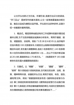 公文开头也称之为引言。所谓引言,就是引出正文的语言,“开门见山”是其写作的基本原则,公文一起笔就要直接点明主旨、触及主旨或为展现主旨开路。开头的方法多种多样,这里介绍一些最基本最常用的。1.概述式。概括简单地叙述有关工作或事件的基本情况或基本过程,为下文的详细叙述或具体分析张本。常用于通报、报告、调查报告、总结等。例如:“5月28日6时05分,由济南开往佳木斯的193次旅客快车,行驶至沈山线锦州铁路局管辖的兴隆店车站时,发生重大颠覆事故,造成3名旅客死亡,143名旅客和4名列车乘务员受伤,报废机车1台……沈山下行线中断运输近20小时,直接损失达170余万元。”(铁道部关于193次旅客快车发生重...
