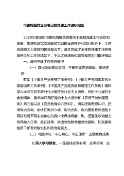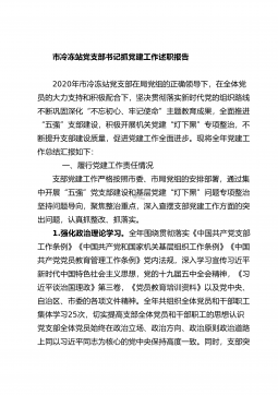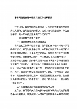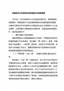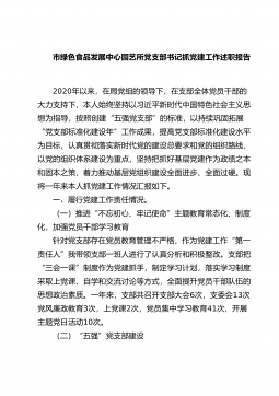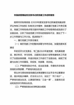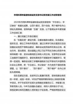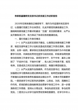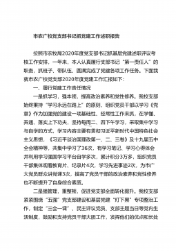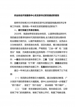 农业综合开发服务中心党支部书记抓党建述职报告按照市农牧局2020年度党支部书记抓基层党建述职评议考核工作安排,现将我一年来抓支部党建情况述职如下:一、履行党建工作责任情况。2020年,我团结带领支部全体党员,认真贯彻落实新时代党的建设总要求和新时代党的组织路线,全力推进支部治理体系和治理能力现代化,以提升制度执行力、创新推进力、全员战斗力为有效抓手,坚持系统化布局、项目化推进,着力推动党的基层组织建设全面进步全面过硬。严格落实“三会一课”和“主题党日”制度,尤其是在疫情过后将每周一下午定为支部集中学习时间,已形成铁的纪律,雷打不动。具体重点抓了以下几项目工作:一是意识形态和宣传思想工作;二是“...