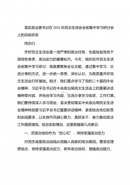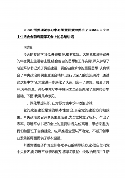 在XX州委理论学习中心组暨州委常委班子2025年度民主生活会会前专题学习会上的总结讲话同志们:今天的专题学习会,开得很好,很有成效。大家扣即将召开紧的年度民主生活会主题,结合各自的思想和工作实际,深入学习了习近平总书记关于党的建设、党的自我革命的重要思想,认真领会了中央政治局民主生活会精神,进行了深入的交流研讨。通过这次集中学习,大家进一步深化了认识、统一了思想、凝聚了共识,为高质量、高标准开好本年度民主生活会奠定了坚实的思想基础。下面,我讲几点意见。一、深化思想认识,在对标对表中筑牢政治忠诚党的政治建设是党的根本性建设,决定党的建设方向和效果。中央政治局召开的民主生活会,为全党树立了标杆、作...