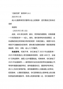 “日新月异”系列№120102025年3月在2022级高三年级百日誓师大会上的讲话:以奋斗为火种点亮生命的星辰大海新疆实验中学校长冯永庄(2025年2月28日)尊敬的老师们、家长们、亲爱的同学们:今天,我们在这里,看到不仅是100天数字的更迭,更是青春与命运的庄严对望,是生命赠予我们最珍贵的礼物——它让我们有机会用一百个昼夜,在理想与现实的碰撞中,镌刻出属于自己的生命印记。一、老师们同学们,生命的印记需要奋斗的力量:这种力量能把现实的重量,压出生命的韧度你们是否想过,为什么敦煌莫高窟的壁画历经千年风沙依然熠熠生辉?因为每一笔颜料里都掺着画工的血汗,每一道金线中都藏着匠人跪地十年的虔诚。这让我想...