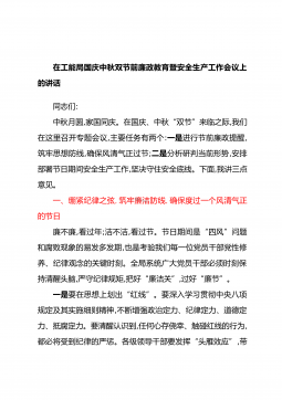 在工能局国庆中秋双节前廉政教育暨安全生产工作会议上的讲话同志们:中秋月圆,家国同庆。在国庆、中秋“双节”来临之际,我们在这里召开专题会议,主要任务有两个:一是进行节前廉政提醒,筑牢思想防线,确保风清气正过节;二是分析研判当前形势,安排部署节日期间安全生产工作,坚决守住安全底线。下面,我讲三点意见。一、绷紧纪律之弦,筑牢廉洁防线,确保度过一个风清气正的节日廉不廉,看过年;洁不洁,看过节。节日期间是“四风”问题和腐败现象的易发多发期,也是考验我们每一位党员干部党性修养、纪律观念的关键时刻。全局系统广大党员干部必须时刻保持清醒头脑,严守纪律规矩,把好“廉洁关”,过好“廉节”。一是要在思想上划出“红线...