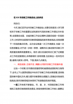 在XX市宗教工作推进会上的讲话同志们:今天,我们召开全市宗教工作推进会,主要任务是深入学习贯彻关于宗教工作的重要论述和新时代党的宗教工作理论方针政策,全面落实全国、全省宗教工作会议精神,回顾总结前一阶段的工作,分析研判当前我市宗教领域面临的新形势新挑战,安排部署下一阶段的重点任务。这次会议既是一次工作调度会,也是一次任务部署会,对于进一步统一思想、凝聚共识,推动我市宗教工作高质量发展具有重要意义。刚才,部分区县的同志汇报了近期重点工作的进展情况,讲得都很好,各有侧重,也反映出一些共性问题,值得大家深入思考。下面,我讲几点意见。一、肯定成绩,正视不足,清醒认识我市宗教工作的基本盘过去一个时期,在...