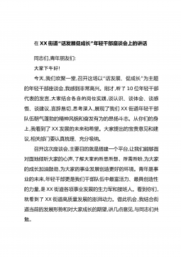在XX“”街道话发展促成长年轻干部座谈会上的讲话同志们,青年朋友们:大家下午好!今天,我们欢聚一堂,“”召开这场以话发展、促成长为主题的年轻干部座谈会,我感到非常高兴。刚才,听了10位年轻干部代表的发言,大家合各自的位践结岗实,谈认识、谈体会、谈感悟、谈建议,言辞恳切,思考深入,展现了我们XX街道年轻干部队伍朝气蓬勃的精神风貌和奋发有为的昂扬斗志。从你们的身上,我看到了XX发展的未来和希望。大家提出的宝贵意见和建议,相关部门要认真梳理、充分吸纳。召开这次座谈会,主要目的就是搭建一个平台,让我们能够面对面地倾听大家的心声,了解大家的所思所想、所需所盼,为大家的成长加油鼓劲,为大家的事业发展创造更...