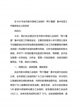 在2025年全市新兴领域工会组织“两个覆盖”集中攻坚工作推进会议上的讲话同志们:今天,我们在这里召开全市新兴领域工会组织“两个覆盖”集中攻坚工作推进会议,主要任务是深入学习贯彻上级关于加强新就业形态劳动者权益保障和工会工作的重要指示精神,总结前一阶段集中攻坚的成果与经验,分析当前面临的形势与挑战,并对下一阶段的重点任务进行再动员、再部署。这次会议既是一次总结会、分析会,更是一次加压鼓劲、决战决胜的誓师会。下面,我讲三点意见。一、回顾过去,成效显著,基础坚实自全市新兴领域工会组织“两个覆盖”集中攻坚行动启动以来,全市各级工会组织和广大工会干部闻令而动、听令而行,以高度的责任感和使命感,对照任务清...