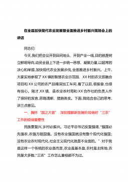 在全县加快现代农业发展暨全面推进乡村振兴现场会上的讲话同志们:今天,我们把会议开到田间地头、开到产业一线,目的就是树立鲜明导向,动员全县上下进一步统一思想、凝聚力量,以超常的决心和举措,加快现代农业发展步伐,全面推进乡村振兴。上午,大家实地参观了XX镇的智慧农业示范园、XX村的农文旅融合项目和XX公司的农产品精深加工车间,看了以后,很振奋,也很有信心。刚才,XX镇、县农业农村局和XX合作社的负责人作了很好的发言,思路清晰、措施务实。下面,我结合自己的思考,讲三点意见。一、胸怀“国之大者”,深刻理解新发展阶段做好“三农”工作的极端重要性民族要复兴,乡村必振兴。习近平总书记反复强调,“强国必先强农...