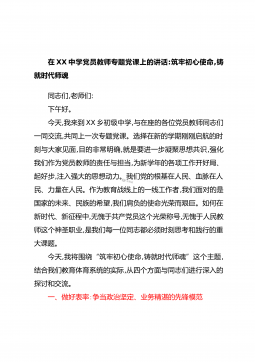 在XX中学党员教师专题党课上的讲话:筑牢初心使命,铸就时代师魂同志们,老师们:下午好。今天,我来到XX乡初级中学,与在座的各位党员教师同志们一同交流,共同上一次专题党课。选择在新的学期刚刚启航的时刻与大家见面,目的非常明确,就是要进一步凝聚思想共识,强化我们作为党员教师的责任与担当,为新学年的各项工作开好局、起好步,注入强大的思想动力。我们党的根基在人民、血脉在人民、力量在人民。作为教育战线上的一线工作者,我们面对的是国家的未来、民族的希望,我们肩负的使命光荣而艰巨。如何在新时代、新征程中,无愧于共产党员这个光荣称号,无愧于人民教师这个神圣职业,是我们每一位同志都必须时刻思考和践行的重大课题。...