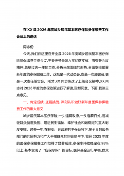 在XX县2026年度城乡居民基本医疗保险参保缴费工作会议上的讲话同志们:今天,我们在这里召开全县2026年度城乡居民基本医疗保险参保缴费工作会议,主要任务是深入贯彻落实省、市有关会议精神,总结过去一年的工作,分析当前面临的形势,全面安排部署新年度的参保缴费工作。这既是一次动员会,也是一次部署会,更是一次责任落实会。刚才,XX同志传达了上级会议精神,XX同志对2026年度的参保政策进行了解读,我都同意。下面,我讲三点意见。一、肯定成绩,正视挑战,深刻认识做好新年度医保参保缴费工作的重大意义城乡居民基本医疗保险,一头连着政府,一头连着百姓,是减轻群众就医负担、增进民生福祉、维护社会和谐稳定的重大制...