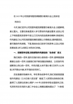 在2025年公司党委专题党课暨警示教育大会上的讲话同志们:今天,我们召开公司党委专题党课暨警示教育大会,主题鲜明、意义重大。主要任务就是深入学习贯彻作风建设要求,动员公司上下特别是党员领导干部,以刀刃向内的自我革命精神,持续深化作风建设,为公司在高质量发展的道路上行稳致远,提供最坚实、最可靠的作风保障。下面,我结合自己的学习和思考,以及公司的发展实际,讲几点意见,与同志们共勉。一、回望百年征程,深刻感悟作风建设的“生命线”意义我们党的一百年,是矢志践行初心使命的一百年,是筚路蓝缕奠基立业的一百年,也是我们党不断加强自身建设、以优良作风凝聚党心民心的一百年。作风问题,从来不是小事,它关乎人心...