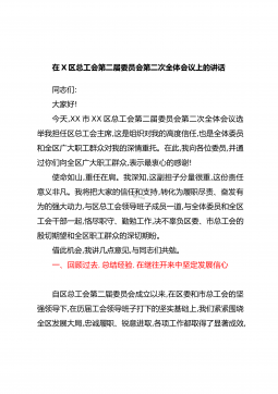 在X区总工会第二届委员会第二次全体会议上的讲话同志们:大家好!今天,XX市XX区总工会第二届委员会第二次全体会议选举我担任区总工会主席,这是组织对我的高度信任,也是全体委员和全区广大职工群众对我的深情重托。在此,我向各位委员,并通过你们向全区广大职工群众,表示最衷心的感谢!使命如山,重任在肩。我深知,这副担子分量很重,这份责任意义非凡。我将把大家的信任和支持,转化为履职尽责、奋发有为的强大动力,与区总工会领导班子成员一道,与全体委员和全区工会干部一起,恪尽职守、勤勉工作,决不辜负区委、市总工会的殷切期望和全区职工群众的深切期盼。借此机会,我讲几点意见,与同志们共勉。一、回顾过去,总结经验,在继...
