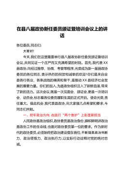 在县八届政协新任委员颁证暨培训会议上的讲话各位委员,同志们:大家好!今天,我们在这里隆重举行县八届政协新任委员颁证暨培训会议,共同见证一个庄严而又充满希望的时刻。首先,我代表XX县政协,向经过推荐、协商、考察等程序,光荣成为新一届县政协委员的各位同志,表示热烈的祝贺和诚挚的欢迎!你们是来自全县各行各业、各条战线的精英和骨干,是推动XX县经济社会发展的重要力量。你们的加入,为县政协组织注入了新鲜血液,带来了新的活力。这次会议,既是一次见面会、颁证会,更是一次培训会、动员会,标志着各位委员履职生涯的正式开启。使命光荣,责任重大。借此机会,我代表县政协,向大家提几点希望和要求,与同志们共勉。一、把牢...