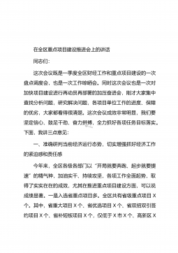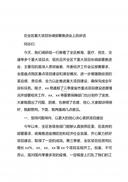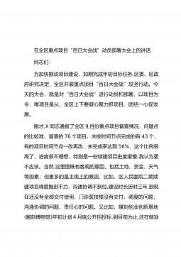 在全区重点项目“百日大会战”动员部署大会上的讲话同志们:为加快推动项目建设,如期完成年初目标任务,区委、区政府研究决定,全区开展重点项目“百日大会战”攻坚行动。今天的大会,就是对“百日大会战”进行动员和部署,以项目为令,唯项目是从,全区上下要凝心聚力抓项目,团结一心促发展。刚才,X同志通报了全区9月份重点项目督查情况,问题点的比较准,督查的76个项目,未按时间节点完成的有43个,有的项目时间节点一改再改,未完成率达到56%,这个比例很高了,进度很不理想,特别是一些续建项目进度缓慢,我认为更不应该。当然,这里面既有客观的原因,包括土地、资金、天气等因素;但更多的是主观上的原因,比如,区人民医院二...