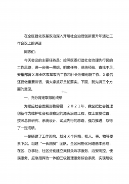 在全区强化双基双治深入开展社会治理创新提升年活动工作会议上的讲话同志们:今天会议的主要任务是:按照区委打造社会治理先行区的工作思路,进一步统一思想,明确任务,总结经验、查找不足,安排部署X年全区双基双治工作和社会治理创新工作。X最后还要做重要讲话,请大家抓好贯彻落实。下面,我先讲三个方面的意见。一、充分肯定取得的成绩为顺应社会发展形势需要,2021年,我区把社会管理创新作为维护社会和谐稳定的源头治理工程,摆上重要位置,按照总体研究、系统设计、试点先行的思路,强力推进,取得了一定成绩。一是搭建了工作架构。划分X个网格,把人、事、物等要素下沉,组建“一长四员”团队,全区网格化网络基本形成;在区、办...