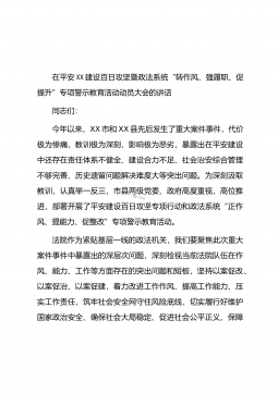 在平安XX建设百日攻坚暨政法系统“转作风、强履职、促提升”专项警示教育活动动员大会的讲话同志们:今年以来,XX市和XX县先后发生了重大案件事件,代价极为惨痛,教训极为深刻,影响极为恶劣,暴露出在平安建设中还存在责任体系不健全、建设合力不足、社会治安综合管理不够完善、历史遗留问题解决难度大等突出问题。为深刻汲取教训,认真举一反三,市县两级党委、政府高度重视,高位推进,部署开展了平安建设百日攻坚专项行动和政法系统“正作风、提能力、促整改”专项警示教育活动。法院作为紧贴基层一线的政法机关,我们要聚焦此次重大案件事件中暴露出的深层次问题,深刻检视当前法院队伍在作风、能力、工作等方面存在的突出问题和短板...
