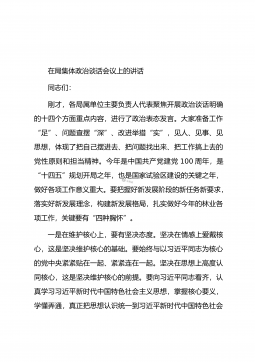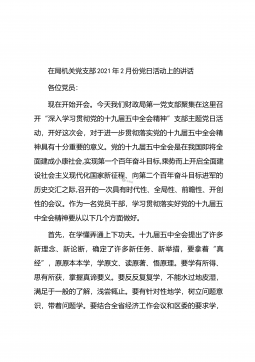 在局机关党支部2021年2月份党日活动上的讲话各位党员:现在开始开会。今天我们财政局第一党支部聚集在这里召开“深入学习贯彻党的十九届五中全会精神”支部主题党日活动,开好这次会,对于进一步贯彻落实党的十九届五中全会精神具有十分重要的意义。党的十九届五中全会是在我国即将全面建成小康社会,实现第一个百年奋斗目标,乘势而上开启全面建设社会主义现代化国家新征程、向第二个百年奋斗目标进军的历史交汇之际,召开的一次具有时代性、全局性、前瞻性、开创性的会议。作为一名党员干部,学习贯彻落实好党的十九届五中全会精神要从以下几个方面做好。首先,在学懂弄通上下功夫。十九届五中全会提出了许多新理念、新论断,确定了许多新...