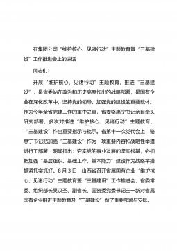 在集团公司“维护核心、见诸行动”主题教育暨“三基建设”工作推进会上的讲话同志们:开展“维护核心、见诸行动”主题教育,推进“三基建设”,是省委站在政治和历史高度作出的战略部署,是国有企业在深化改革中,坚持党的领导、加强党的建设的重要载体。作为今年全省党建工作的重中之重,省委骆惠宁书记亲自牵头研究部署,多次对推进“维护核心、见诸行动”主题教育、“三基建设”作出重要指示与批示。省第十一次党代会上,骆惠宁书记把加强“三基建设”作为一项重要内容和战略性举措进行了部署,明确指出:夯实党的事业发展的坚实根基,必须把加强“基层组织、基础工作、基本能力”建设作为战略举措抓紧抓实抓好。8月3日,山西省召开省属国有...