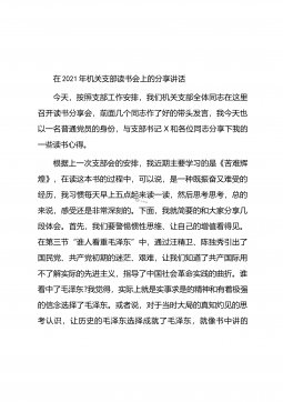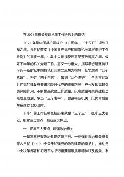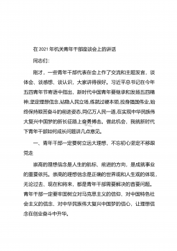 在2021年机关青年干部座谈会上的讲话同志们:刚才,一些青年干部代表在会上作了交流和主题发言,谈体会、谈感想、谈认识,大家讲得很好。习近平总书记在今年五四青年节寄语中指出,新时代中国青年要继承和发扬五四精神,坚定理想信念,站稳人民立场,练就过硬本领,投身强国伟业,始终保持艰苦奋斗的前进姿态,同亿万人民一道,在实现中华民族伟大复兴中国梦的新长征路上奋勇搏击。借此机会,我就新时代下青年干部如何成长问题讲几点意见。一、青年干部一定要树立远大理想,不忘初心坚定不移跟党走崇高的理想信念是人生的航标、前进的方向,是成就事业的重要依托。崇高的理想信念是正确的世界观和人生观的体现,无论过去、现在和将来,都是青...