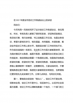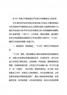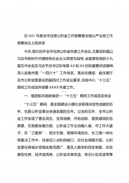 在2021年度全市住房公积金工作部署暨全面从严治党工作部署会议上的讲话今天,我们召开全市住房公积金年度工作会议,主要目的是以习近平新时代中国特色社会主义思想为指导,全面贯彻党的十九届五中全会及习近平总书记在考察XX和XX时的重要讲话精神,深入实施市委“一四六十”工作体系,落实住建部、省住建厅及市公积金管委会四届四次工作会议要求,总结中心“十三五”期间工作成效并部署XXXX年度工作。一、锚定航向砥砺奋进—“十三五”期间工作成效及体会“十三五”期间,是全面建设小康社会取得决定性成就的五年,也是公积金事业快速发展的五年。过去的五年,全市公积金工作实现了惠及民生、支持消费、开拓创新、提质增效的总愿景,...
