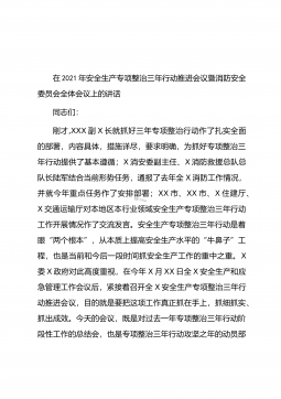 在2021年安全生产专项整治三年行动推进会议暨消防安全委员会全体会议上的讲话同志们:刚才,XXX副X长就抓好三年专项整治行动作了扎实全面的部署,内容具体,措施详尽,要求明确,为抓好专项整治三年行动提供了基本遵循;X消安委副主任、X消防救援总队总队长陆军结合当前形势任务,通报了去年全X消防工作情况,并就今年重点任务作了安排部署;XX市、XX市、X住建厅、X交通运输厅对本地区本行业领域安全生产专项整治三年行动工作开展情况作了交流发言。安全生产专项整治三年行动是着眼“两个根本”,从本质上提高安全生产水平的“牛鼻子”工程,也是当前和今后一段时间抓安全生产工作的重中之重。X委X政府对此高度重视,在今年X...
