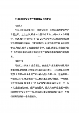 在XX单位安全生产专题会议上的讲话同志们:今天,我们在这里召开一次意义特殊、任务明确的安全生产专题会议。这次会议,既是一次警示教育会,也是一次工作部署会。刚才,“我们共同学习了11·26”XX特大火灾事故的相关情况及其重要指示精神。这起事故的发生,情节极其严重,教训极其惨痛,为我们敲响了振聋发聩的警钟。在此,我提议,我们全体起立,为在这次事故以及所有安全生产事故中不幸罹难的同胞默哀。(请坐下)同志们,人民至上,生命至上。安全生产,是展的底发线,是民生的保障,更是我们必须坚决扛起的政治责任。任何时候,任何情况下,人民群众的生命安全都必放在第一位。不是一财产须这绝句空洞的口号,而是我们一切工作的出...