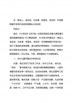 在“做实人、说实话、办实事、抓落实、求实效”作风整顿提升专项行动动员部署会上的讲话同志们:刚才,XX同志对《关于进一步规范党政机关重大事项请示报告制度的意见》作了解读说明,XX同志对开展这次“做实人、说实话、办实事、抓落实、求实效”作风整顿提升专项行动,进行了具体的安排部署,请大家抓好贯彻落实。六名同志所作的心得体会交流发言,剖析是到位的,认识是深刻的,希望大家吸取教训,引以为戒。下面,我再强调三个方面的意见。一、为什么要开展这次专项行动近期,我们召开了经济工作会、农村工作会、党代会、“两会”、警示教育大会、政法队伍教育整顿部署会、人居环境整治现场会等一系列会议,会议如此密集,我们还要专门召开...